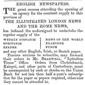 Newspaper from home, wherever that might have been, provided a critical link to the world that many of Aotearoa New Zealand’s 19th century settlers had left behind. New Zealand newspapers printed stories from English and other newspapers, mechanics’ institutes stocked various papers for overseas (Schrader 2016: 133) and subscriptions to these papers were available – our addiction to the news is nothing new! Image: Lyttelton Times 17/4/1858: 5.
