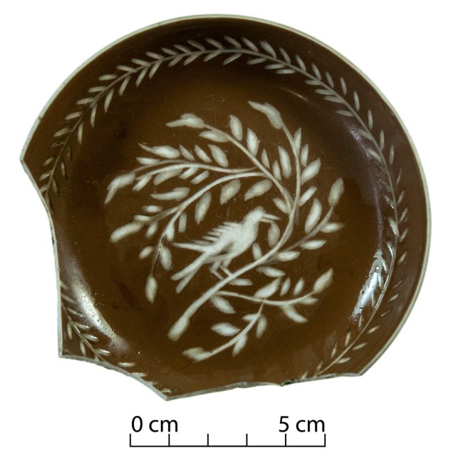 Another unusual artefact was found in the same assemblage. This, a brown glazed porcelain dish through which a bird and foliage design had been engraved, resembles a style of pottery popular over a century before Christchurch was settled by Europeans. Known as Batavian ware, after the port through which the original porcelain was shipped (Batavia/Jakarta), this ware consisted of Chinese export porcelain that had been covered with a brown glaze, sometimes with windows to the original porcelain or further decorated by European engravers, with bird and foliage designs (Li 2012; Nilsson 1998-2019; MacPherson 2020; Kerr 2011). Given the dates of popularity for this ware – the 1720s to 1730s – it was a deeply confusing artefact to find in a post-1850s Christchurch context and possible explanations for its presence ranged from an heirloom brought over by a settler to a nineteenth century imitation. The latter was supported by the relatively crude nature of the engraving and what appeared to be a softer porcelain paste for the body of the dish, rather than the harder Chinese porcelain expected for an original.