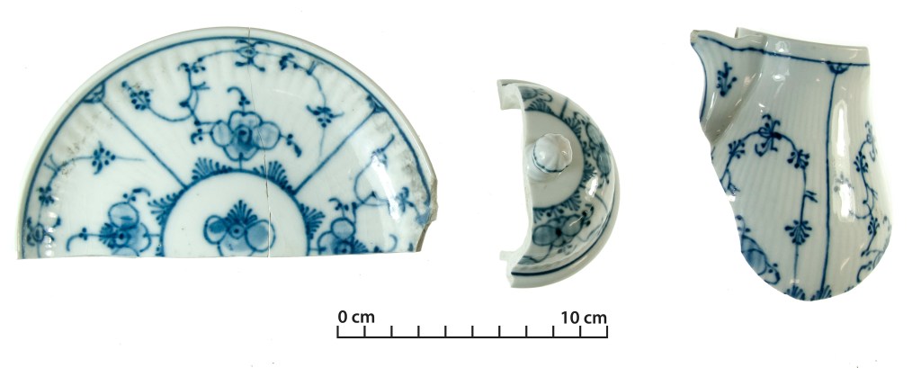 An imitation of the Blue Fluted Plain or Pattern No. 1, found in Christchurch. The motif refrences stylised Chrysanthemum and cinquefoil flowers and is another example of Chinese-inspired design. The decoration on the Christchurch vessels is cruder, particularly the definition of the cinquefoil flowers, and heavier in colour than many of the examples of Blue Fluted Plain that exist elsewhere, both modern and antique. An email conversation with someone at the Royal Copenhagen factory suggests that the Christchurch examples are not originals, but may be German or English imitations (pers. comm. Nottelmann, September 2019). Image: J. Garland.