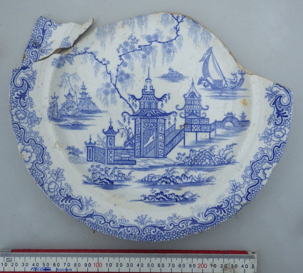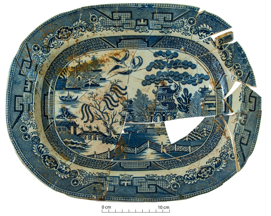 Willow pattern platter from a Christchurch site, alongside a Whampoa patterned plate, another example of Chinoiserie ceramic decoration.