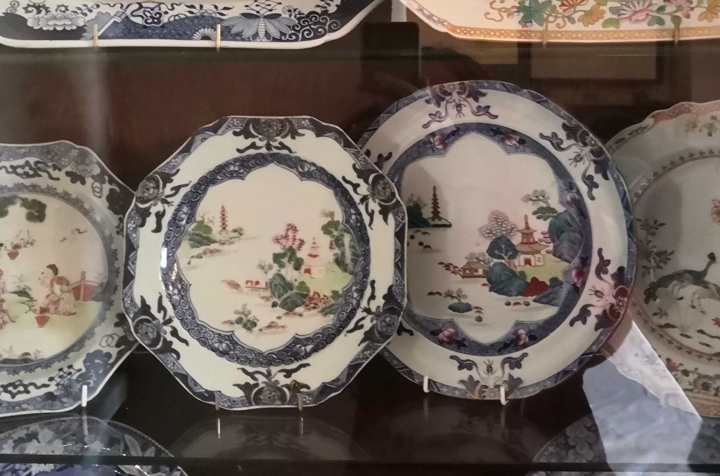 Because of the demand for Chinese porcelain, British potters – such as Spode – would reproduce patterns in their entirety, as well as producing patterns that claimed ‘inspiration’ from Chinese designs. Several of these are held by the Spode/Copeland museum in Stoke-on-Trent, showing both the original Chinese porcelain plate (left) and the British reproduction (right). Image: J. Garland.
