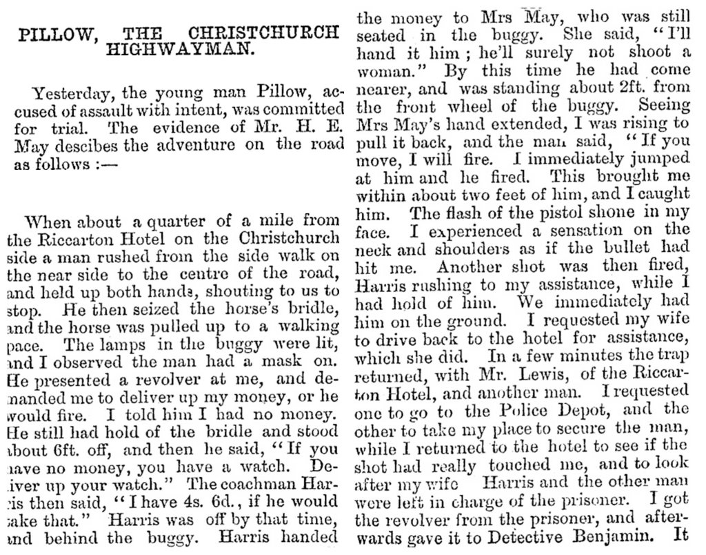 The people being held up did not take kindly to it, there was a bit of a scuffle and Albert was arrested and charged with assault and, after the police had searched his bedroom at his dad’s house and found the imitation poignard, and two spear heads from the museum, larceny. Headlines at the time had fun telling the story of “Pillow, the Christchurch Highwayman” and the story lived on long enough to be included in George Ranald Macdonald’s Dictionary of Canterbury Biography entry for the Pillow family. In it, Macdonald has this to say about Albert’s actions and motivations: “A youth of 18 after doing a course of Dead-Eye Dick literature stole 2 daggers from the museum and armed himself with a revolver and ammunition. Putting on 2 suits to increase his size, he held up a carriage in Riccarton. He couldn’t quite carry it off and was charged with assault.”