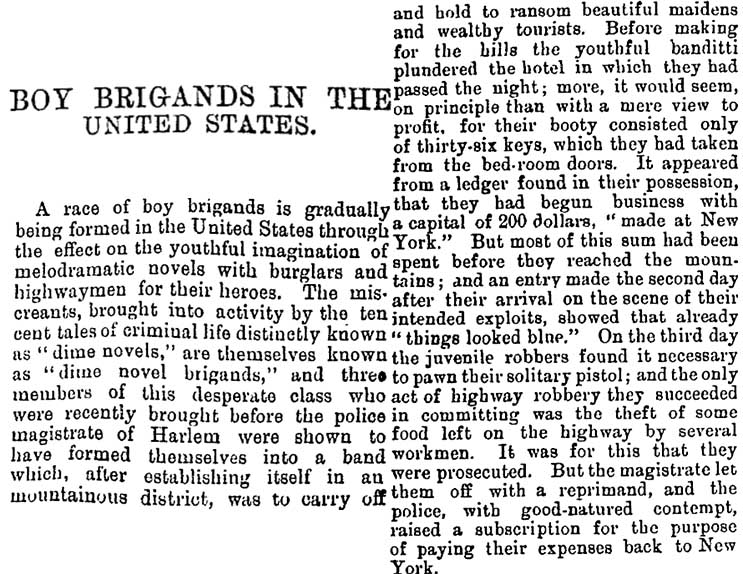 The emergence of dime novels seems to be attributed to Irwin P. Beadle and company in 1860s America (well in time for Albert Pillow to have grown up with them) and they were very popular by the 1870s, when they’re first mentioned in New Zealand newspapers. As the decades progress, they quickly become associated with bad behaviour – not just of children! – in newspaper accounts, a kind of anti-moralistic devil-on-the-shoulder kind of influence (not far from the modern day “kids and their videogames!” I reckon). All of which might come to explain why George Macdonald uses the term to explain Albert Pillow’s somewhat ill-fated actions in 1879 (although it’s worth noting that I couldn’t find a reference to dime novels in the 1879 accounts of the incident).