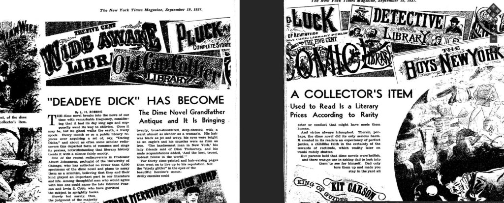 It turns out that “Dead-eye Dick literature” refers to the dime novels of the late nineteenth and early twentieth-century, stories of adventure and daring – often in the American west – that featured characters like “Deadwood Dick”(possibly based on a real cowboy, Nat Love?) and “Dick Deadeye”, among many others. The term ‘dead-eye” seems to be synonymous with marksmanship and straight shooting, although it might also have something to do with sailors but, by the 1930s, “Dead-eye Dick literature” appears to have become a proxy for all dime novels, as this 1937 headline in the New York Times magazine suggests.