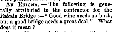 In nineteenth century New Zealand, it seems to have been co-opted by everyone from politicians, advertisers and entertainers to those who also seemed to be confused by it, including a contractor who managed to baffle the Lyttelton Times by stating that “good wine needs no bush, but a good bridge needs a great deal”.