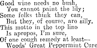 I really didn’t understand this one when I read it. I came across it in an advertisement for Woods’ Great Peppermint Cure, which is ironic, as the phrase appears to mean that a good quality item or product requires no advertising (similar sentiment to gilding the lily, I think). It seems to be derived from two things – the use of a branch or bunch of ivy, hung outside a tavern, to advertise the presence of wine within and a very old tradition of adding a ‘bush’ of rosemary to drink to improve the flavour. Like so many English idioms, it’s also Shakespearian, found in the epilogue to As You Like It.