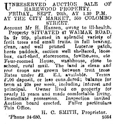 The sale notice for Hans Hansen’s Harewood property, in 1930. This description pretty much fits exactly what the Liberal government were envisaging leaseholders in the hamlets would develop. Image: Press 18/9/1930: 18.