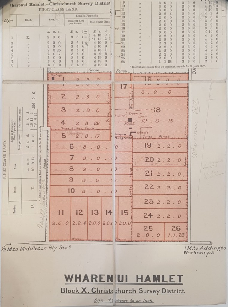 The details of the Wharenui Hamlet. Note the information about the distance to the Addington (railway) workshops, which employed large numbers of working class men, and the Middleton railway station. Image: Department of Lands and Survey, 1897.