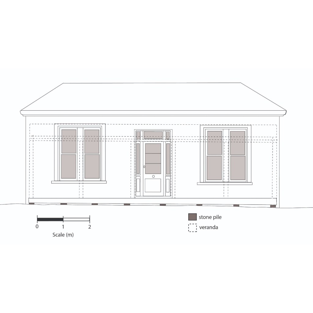 John Larkin’s house in 2014, showing its saltbox form. The veranda was not original, and the original windows had been replaced. Image: P. Mitchell.